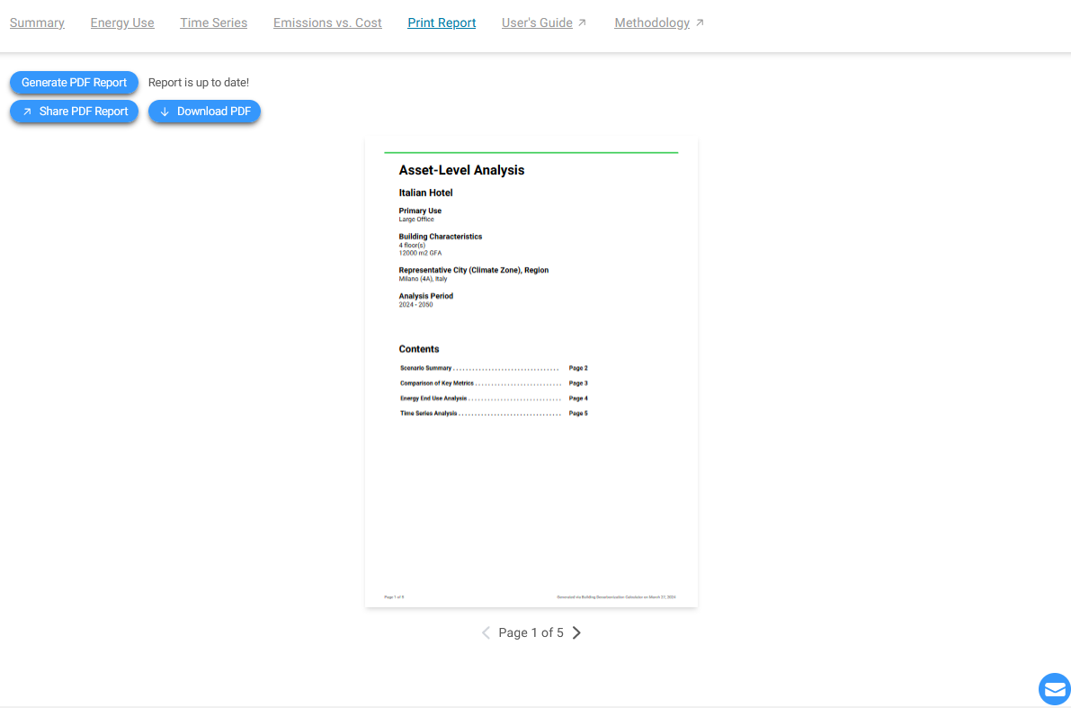 This PDF is not automatically regenerated when you update the scenarios. If the text by the report reads Report does not reflect recent changes then you have made changes to the asset which are not currently reflected in the PDF. In this case, you will need to re-generate the PDF to synchronize it with the recent changes in the app.